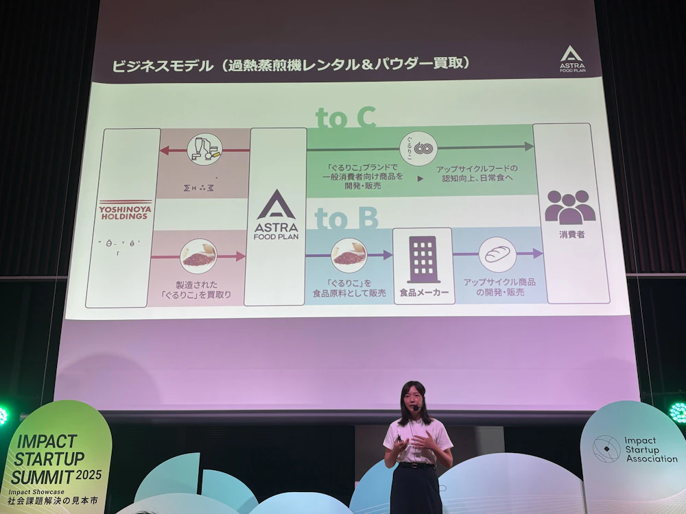 2025年のインパクトスタートアップピッチ大賞に選ばれたのは、「隠れフードロス」に取り組むASTRA FOOD PLAN株式会社。食品工場で廃棄される野菜の端材やジュースの搾りかすを、独自の乾燥技術で香り高い食品パウダーへとアップサイクルする事業を展開している。