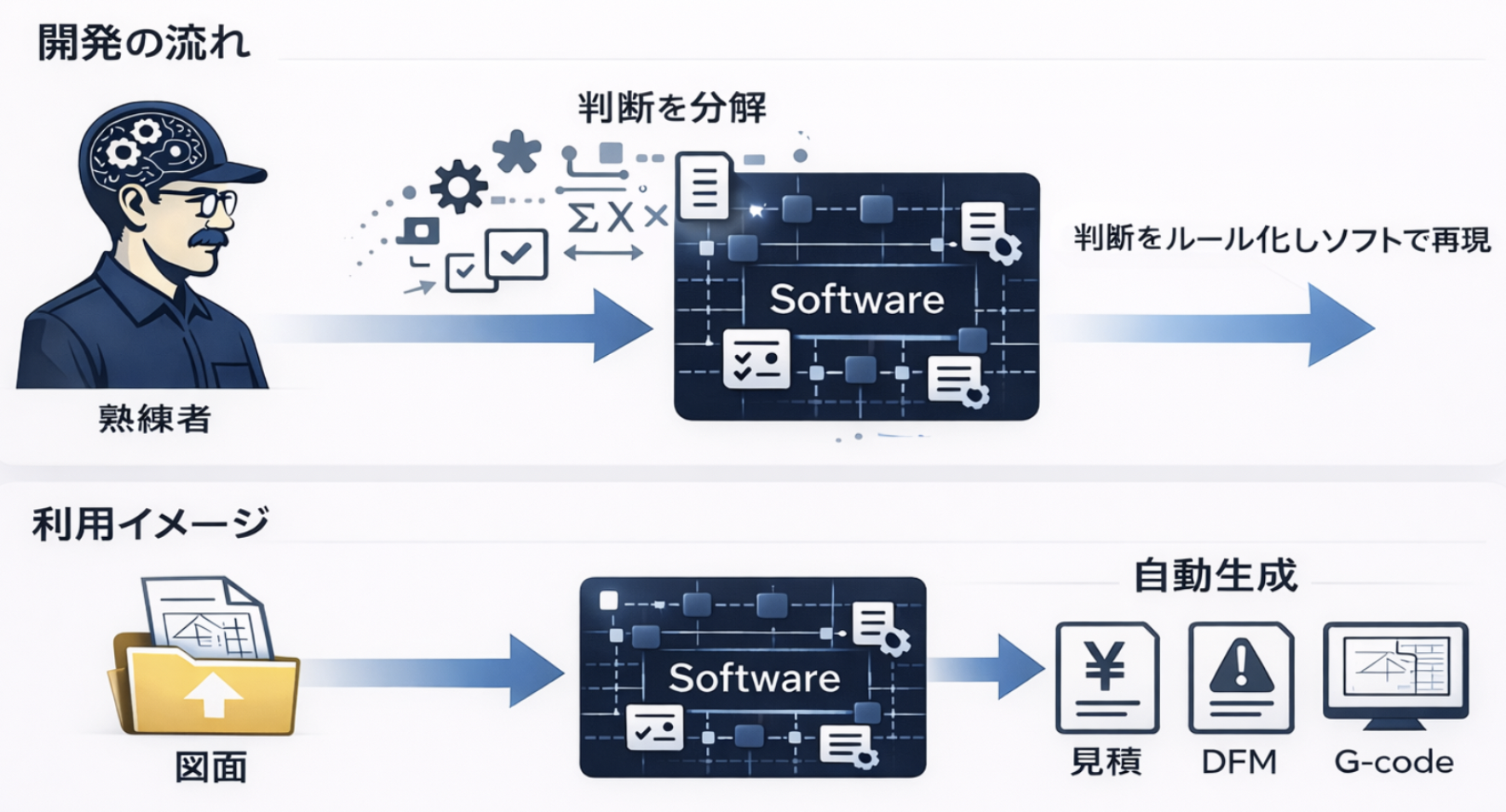 熟練技術者の判断とそれを裏付ける知識をまず言語化するところから始めます。熟練技術者は図面を見た瞬間に、「この素材でこの形状なら、この工具を使ってこう削るから見積はこれぐらい、G-codeはこうなる」という一瞬の判断をするのですが、そうした暗黙知をまずルールベースのソフトウェアとして再現する。「素材の厚みが3ミリ以上ならこのプロセス、以下ならこちら」というシンプルな分岐から始めていくイメージです。