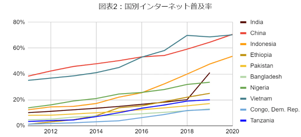 加えて、農村エリアでこうしたサービスが普及する前提として、インターネット普及率も大きなカギになると想定される。上述の各国のインターネット普及率は、World Development Indicatorによると下図の通りとなっており、中国、ナイジェリア、ベトナムなどが比較的普及しやすいと想定されるが、コンゴやバングラディシュなどではもう少し時間を要するであろう。