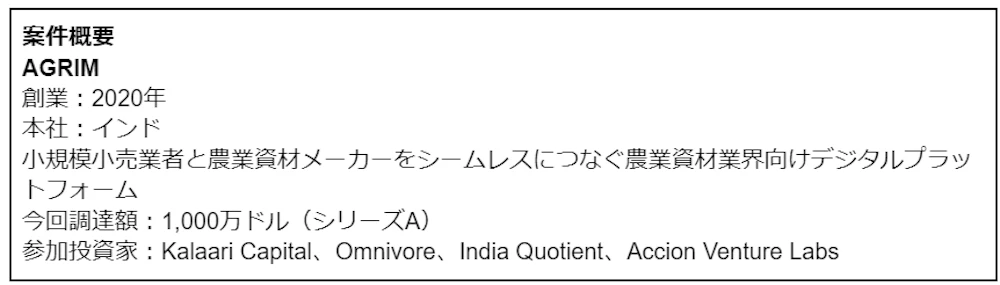 調達を行った。AGRIMはインドにて種子、肥料、作物保護、動物栄養、農機具など幅広い農業投入材を扱うB2Bプラットフォームである。Inc42によると、AGRIMのプラットフォームは2,500以上のメーカーと17万以上の小売業者が利用しているとのことだ。
