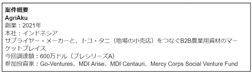 2月28日週に、種子や肥料、農薬などの農業投入財のB2Bマーケットプレイスを展開するインドネシアのAgriAkuが資金調達を行った。同社は、サプライヤーに対して会計・在庫管理ツール提供、商品予測支援も行っている。2021年5月の開設以降、GMV(流通取引総額)は、前月比200%で伸びているといい、現在10,000件の農家店舗がアクティブユーザーで登録されている。