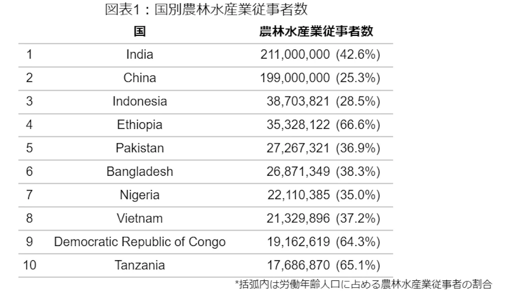 2019年のOur World in Dataのデータによると、農業人口数は下表の通りとなっている。