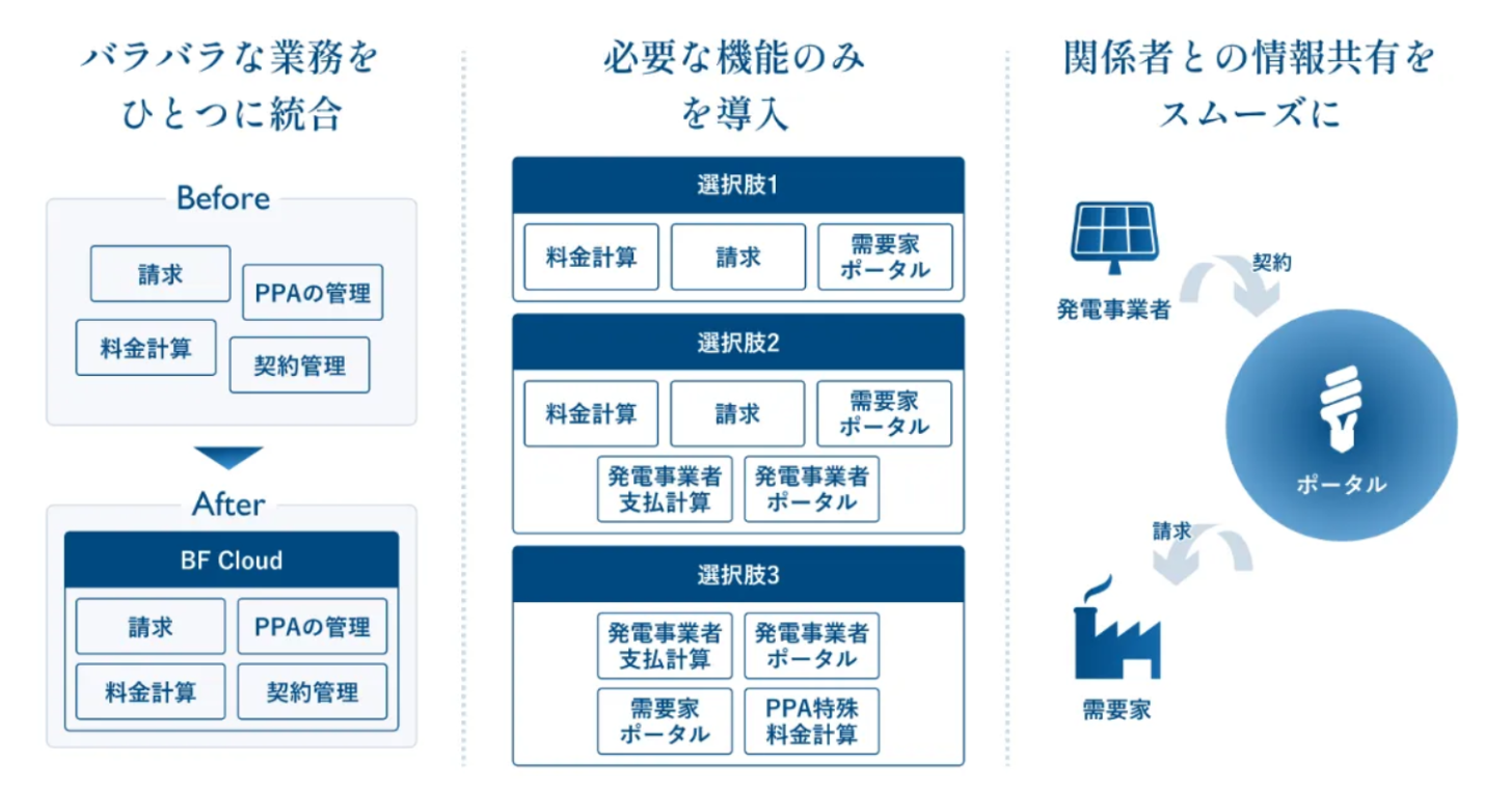 すでに複数の事業者向けにコーポレートPPAの請求管理システムを開発しており、順次リリース予定です。今後は請求管理だけでなく、PL分析や営業支援機能も追加していきます。さらに、電力事業者の規模やニーズに応じて、AIを活用したBPO(ビジネス・プロセス・アウトソーシング)サービスの提供も検討しています。BF Cloudとセットで使っていただく場合もあれば、まずBPOから始めて電力事業が成長した段階でシステム導入に移行するという段階的な活用も想定しています。