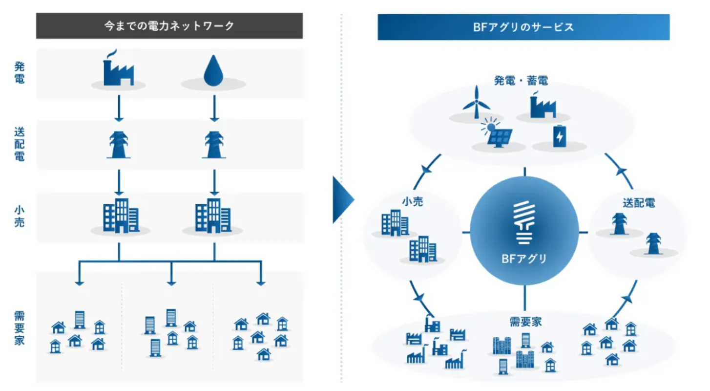 1つは、太陽光発電所に特化したアグリゲーション事業「BFアグリ」。特定卸供給事業者(アグリゲーター)として、太陽光発電所などを束ねて運用する事業です。