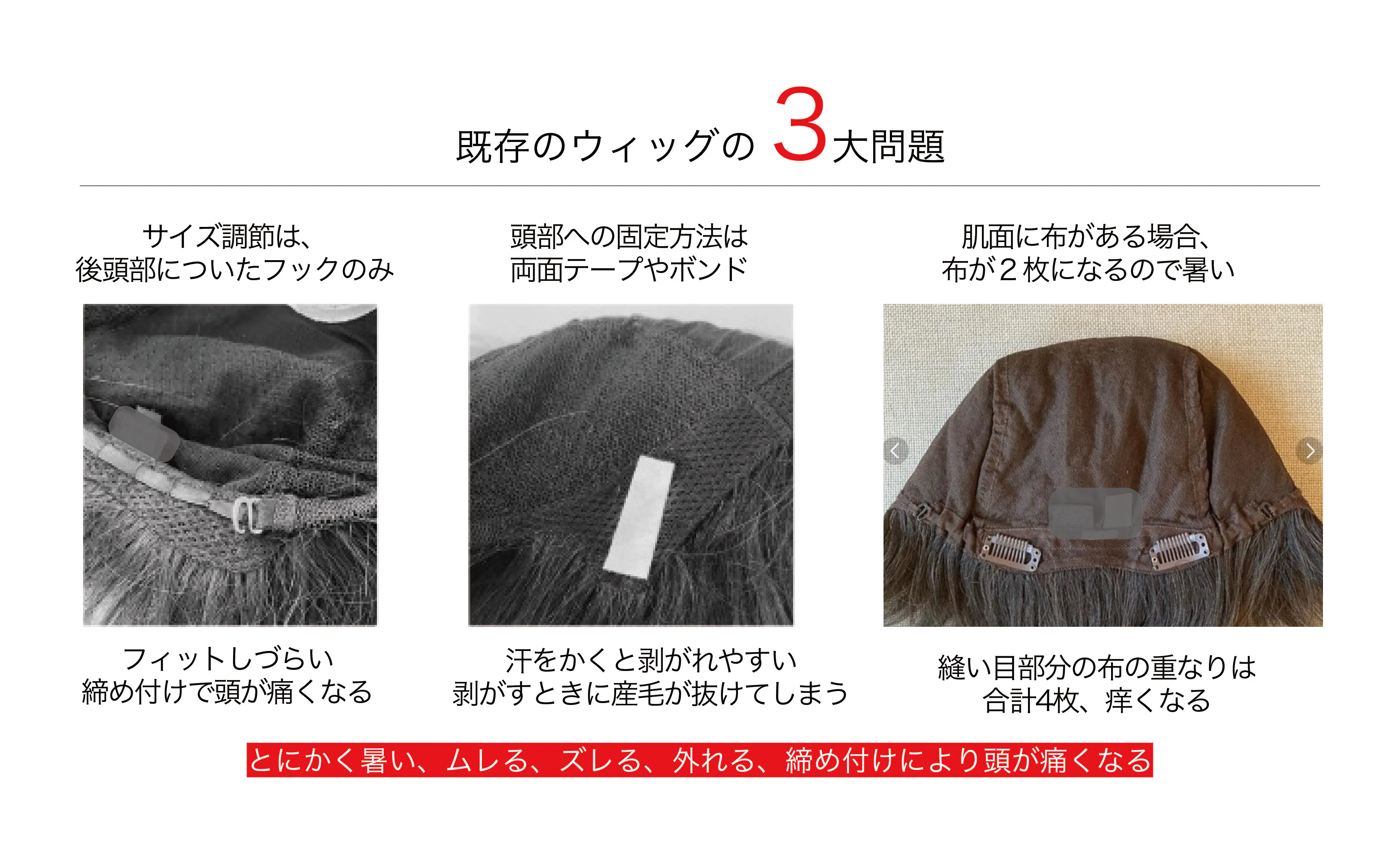 池野氏によると、ウィッグ市場には既存の大手メーカーが存在するが、従来の医療用ウィッグの多くは「自然に見えること」を重視した設計で、スポーツに適したウィッグは国内には見られなかったという。「炎天下で裏地付きの毛皮の帽子をかぶって運動しようとはならないが、既存のウィッグはその状態に近い」と同氏は話す。蒸れや重さに加え、ウィッグを頭部に固定する手段は後頭部のフックや両面テープのみで、ずれやすさや頭部への締め付けなどの問題が残っていた。
