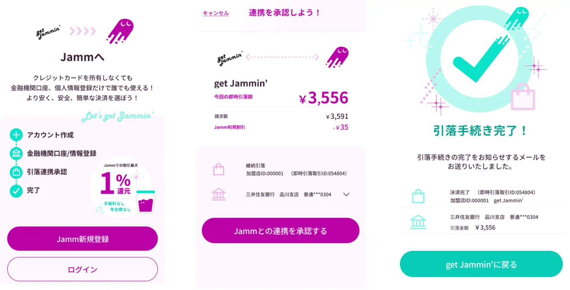 初回利用時は個人情報と銀行口座を登録する。決済時にはJammでの支払いを選択し、利用する携帯端末の認証機能で承認することで即座に銀行口座から引き落とされる。