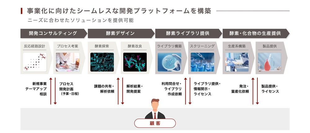 今後は、産業用酵素を出口とした高機能な酵素のライブラリ構築により、酵素や化合物の製品製造にも力を入れていく計画です。ニーズに合わせたソリューションを提供するため、シームレスな開発プラットフォームを目指します。