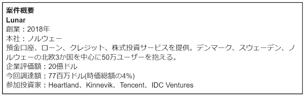 同率第二位は、ネオバンクのLunar(企業評価額:20億ドル)でした。Lunarが北欧でサービスを開始したとき、すでに北欧の銀行業務は世界的に非常に先行しており、約95%の消費者が既存企業が提供するデジタルバンキングサービスを利用していました。その中での競争を勝ち抜くために、Lunarは既存インフラとの統合やID番号を軸としたサービス展開というアプローチを取りました。高い参入障壁を乗り越えた経験から、Lunarの社長は、 「北欧でネオバンクとして成功できれば、どこでも成功できる」と考えています。日本では、インターネット専業銀行の住信SBIネット銀行がIPOを計画していました。3000億円規模の案件になると報道されていましたが、市況悪化により、上場を取りやめました。