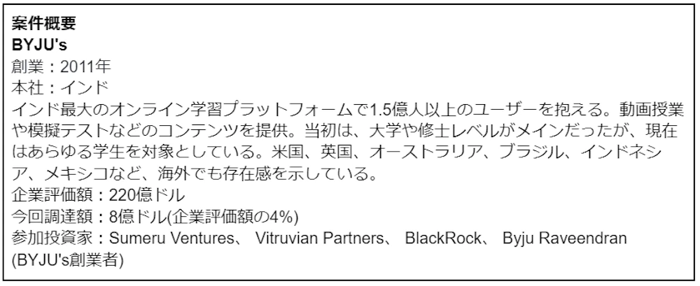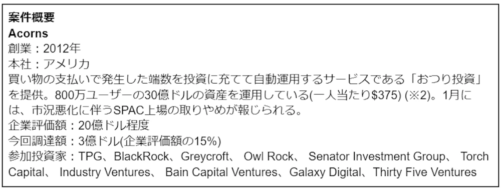 第二位は、おつり投資アプリのAcorns(企業評価額:20億ドル程度)でした。ロボアドバイザーなどと同じく、投資初心者の投資ハードルを下げるものとして、人気です。日本では、「トラノコ」(TORANOTECが運営、2021年に29億円を調達)や「マメタス」(マザーズ上場のウェルスナビが運営)が類似企業です。BYJU’sの案件同様、世界最大手の資産運用会社であるBlackRockが資金調達に参画したのが興味深いです。