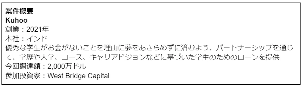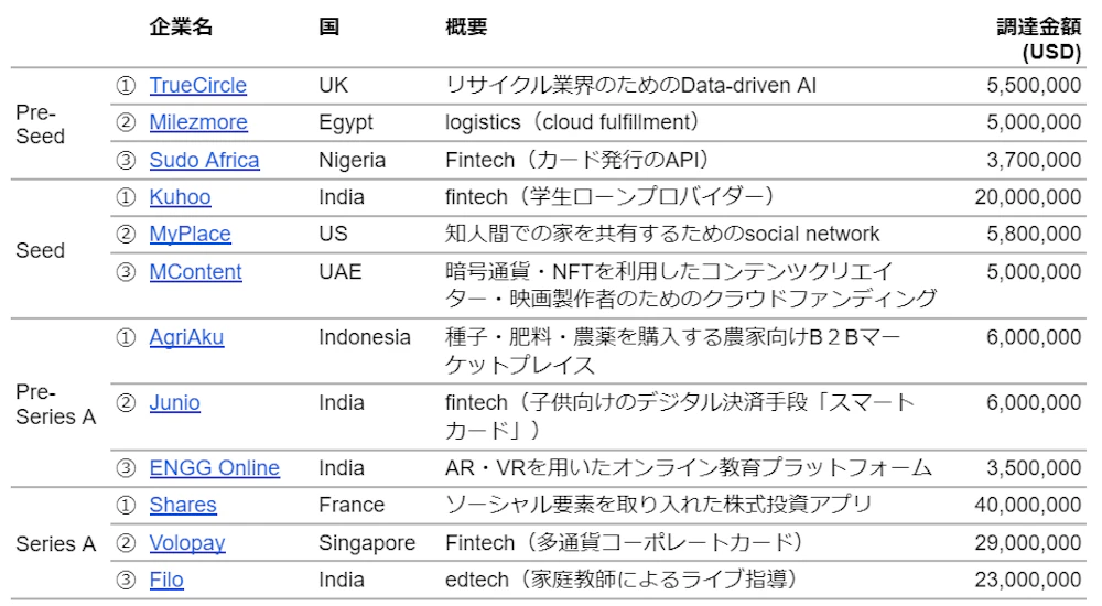 Seed・Pre-Seedの中で最大の調達案件はインドのKuhooによる2,000万ドルの調達でした。Kuhooは大学やMBAの学生を、ローンを提供するパートナーのNBCFや銀行につなぐフィンテック企業です。インドでは18歳から23歳までのうち、100人に約73人が大学を中退しているといいます。