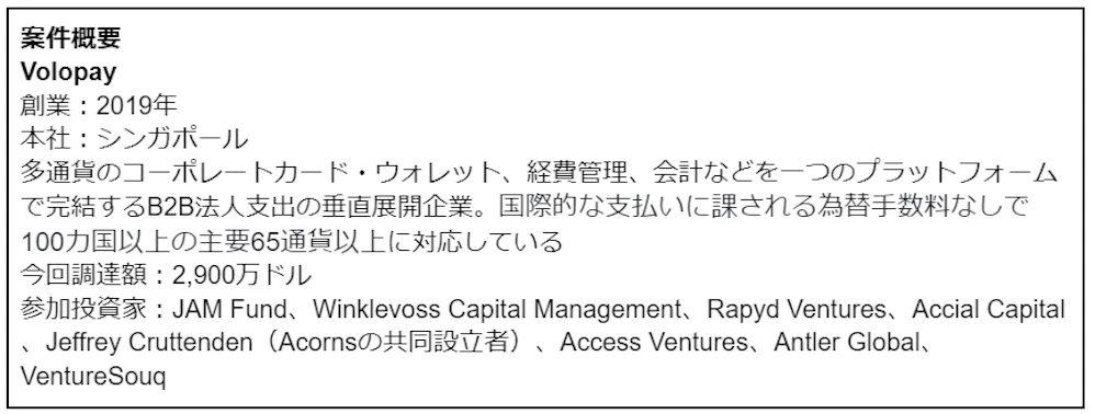 2番目はシンガポールの多通貨で利用ができるコーポレートカードの発行や企業の経費管理ソフトウェアを提供するVolopayは2,900万ドルを調達しました。今回の調達は株と負債を合わせた調達となりました。今後APACや中東、北アフリカでの事業拡大を目指しているとのことです。TechCrunchの記事によると、同社のプラットフォームで動く資金の総額は2021年1月段階にてMoM70%増で成長。シードラウンド以降、ひと月の合計取扱額は98%増加し、売上も41%増加していると共同創業者兼CEOのShaji氏は指摘しています。また、同社は2021年1月のシードラウンド時の顧客数が約100社から、Funding Societies、Zipmex、Moneysmart、Smartkarma、Austrionovaを含む700以上の顧客獲得に成功しており、急拡大をしてきたことが分かります。直近では、類似企業として、Payhawk(UK)のシリーズB、Alaan(UAE)のシード調達もありました。