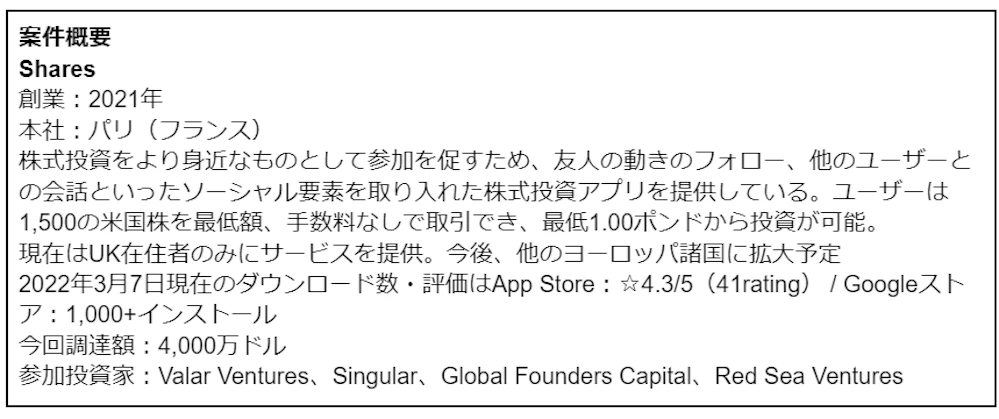 最も大きく資金調達したのはフランスのSharesでした。Sharesは友人や他のユーザーと投資戦略を相談したりフォローしたりしながら株式投資ができるアプリを提供しています。シードステージから参加してきたValar Venturesが主導してシリーズAにて4,000万ドルの調達に成功しました。