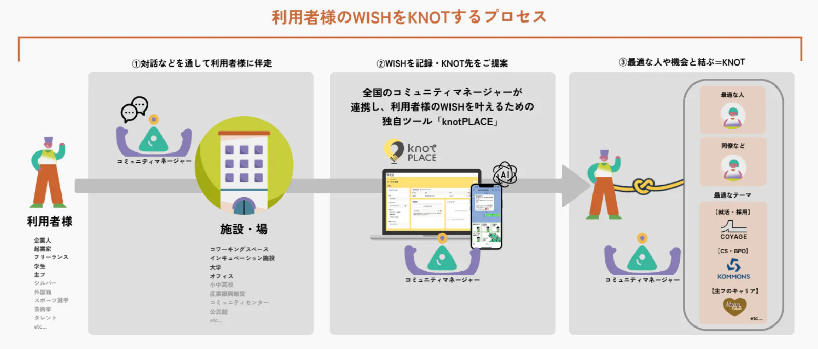 コミュニティマネージャーと利用者の会話ログは、自社開発のコワーキングスペース一括管理システム「knotPLACE」に登録され、他拠点のコミュニティマネージャーと共有される。拠点を超えて、人や機会を繋げるための仕組みだ。
