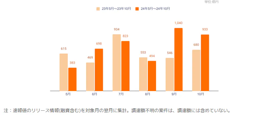 ケップルの調査によると、2024年10月の日本のスタートアップの資金調達総額は933億円(前月比10%減)、資金調達件数は177件(前月比13%増)だった。過去6か月間の月次資金調達金額推移は以下の通りとなった。