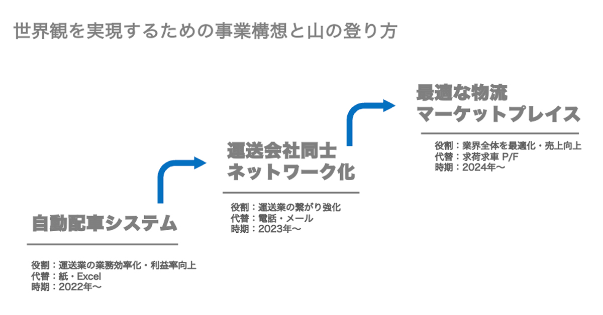 まずは2023年度中に、自動配車システム「LOG」を市場で確立させ、100〜200社までユーザーを増やしたいと考えています。それと並行して、運送会社同士のネットワーク化に取り組みます。同じ配車システムを使っている会社同士、余った荷物や車両の情報を紐付けます。こちらはすぐにでも着手予定で、2023年度にプロダクトとして確立したいです。2024年までには物流のマーケットプレイスを構築し、業界全体の最適化を目指します。