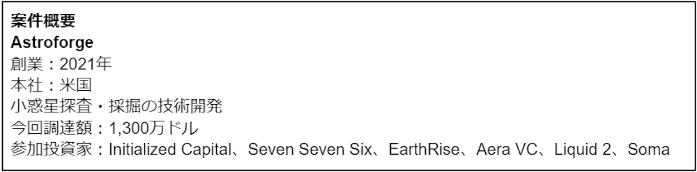 シードラウンドで1,300万ドルを調達したAstroforgeは小惑星の採掘にチャレンジするスタートアップです。10年以内に小惑星の採掘・物質の持ち帰りを実現することを目指しています。同社は宇宙空間で物質を製錬する技術を開発したとしていますが、多くのことは明かしていません。ライドシェアの利用につき、ペイロード200kg以下の比較的軽量なオペレーションを目標としており、白金族金属を豊富に含む惑星に焦点をあてている様子です。Astroforgeのターゲットは直径20m~1.5kmの小惑星であり、地球近傍の1,000万の天体のうち、100万弱の天体に関心を抱いているといいます。