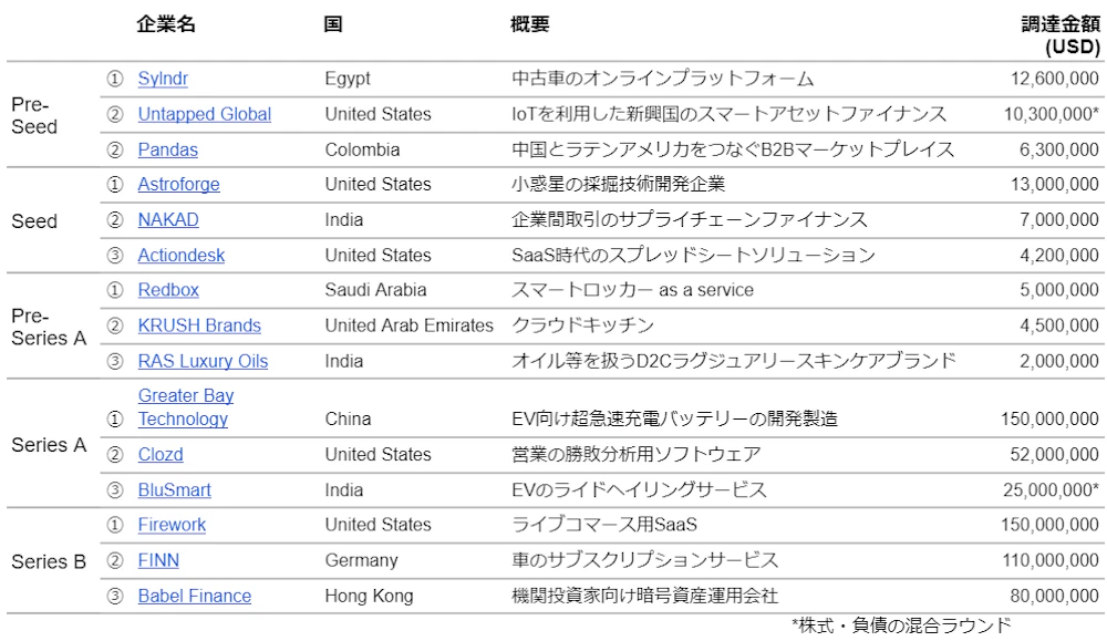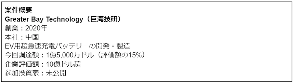 シリーズAの調達で調達額が大きかったのは中国でEVバッテリー及び充電/蓄電システムを開発するGreater Bay Technology(巨湾技研)です。地球温暖化対策としてEVの普及が急速に進みつつある中、バッテリーに対する需要は強まっており、中国の大手車メーカー広州汽車集団(GAC)からスピンオフする形で設立した同社は2年弱でユニコーンとなりました。