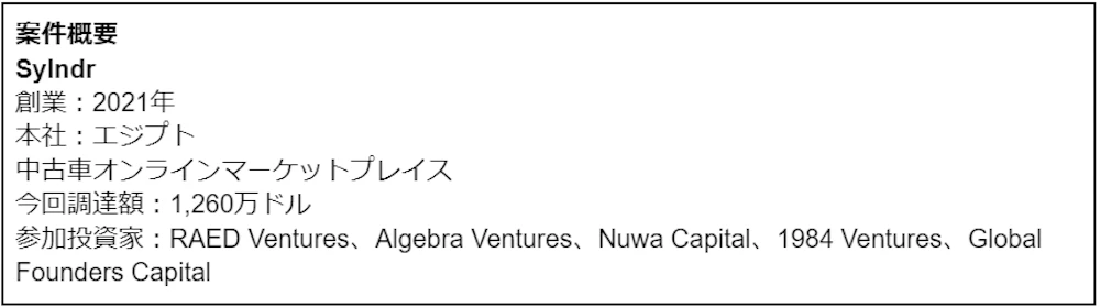 プレ・シードで1,260万ドルを調達したSylndrはエジプトで中古車のオンラインマーケットプレイスを運営しています。2週間前にはシリーズAの大型調達として同じく中古車販売プラットフォームを運営するオーストラリアのCarmaを紹介しており、同領域は過熱しているセクターの一つです。