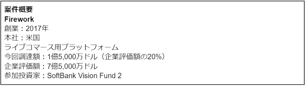 シリーズB1社目は、小売業者向けにライブストリーミングツールを提供するSaaS企業、Fireworkです。以前はショート動画アプリを提供する企業でしたが、現在はB2B企業として、顧客が自社サイトにショート動画を配信したり、動画からシームレスな購入体験を提供できるようなソリューションを提供しています。また、Fireworkを利用すると、Instagram、TikTok、LINE、YouTube、Facebook、Twitterといった主要なソーシャルメディアに同時に配信することができます。