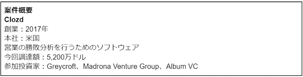 シリーズAで5,200万ドルを調達したのは米国の営業支援ソフトウェアを提供するClozdです。Clozdは顧客の法人が営業の勝敗分析、すなわち過去の取引を調査し、なぜセールスが勝敗に至ったのかを評価するプロセスを実施するためのサービスを提供しています。2019年のアクセンチュアのレポート(※4)によると、勝敗分析を実施した企業は営業の勝率を18%挙げることができたという一方で、勝敗分析を実施している企業は半数以下しかない現状があります。
