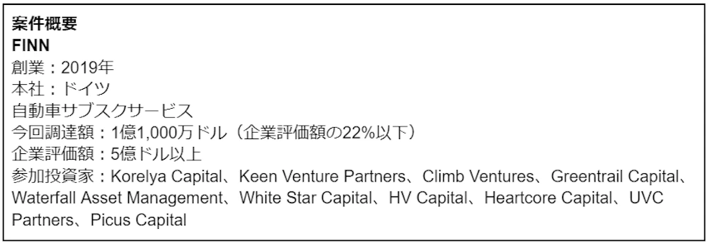 シリーズBで1億1,000万ドルを調達したFINNは欧州及び米国でEVを含む自動車のサブスクリプションサービスを提供しています。グローバルの自動車のサブスクリプション市場は2020年は41億ドル規模でしたが、2025年には112.5億ドル、2030年には317.3億ドル規模に上るとされています(※8)。サブスクリプションサービスは、スタートアップだけでなく、トヨタ自動車傘下のKINTOなど自動車メーカー自身も提供するケースがあります。