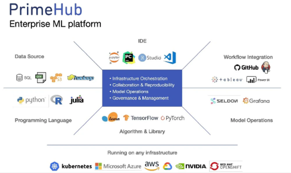 InfuseAIのMLOpsプラットフォーム「PrimeHub」は、データチームとITチームが密接に連携できるワンストップAIプラットフォームである。このプラットフォームは、Kubernetesとコンテナを使用して、さまざまなAI環境を迅速に構築し、管理することができる。このプラットフォームは、TensorFlow、PyTorch、Caffeeなどの主流の深層学習フレームワークをサポートするだけでなく、アイデンティティとアクセス管理機能、およびリソース管理機能も提供する。 PrimeHubは、様々な主流のAIツールを一緒に統合している。画像クレジット:InfuseAI