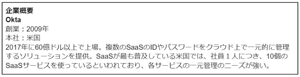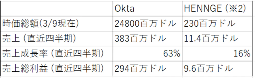 日本では、マザーズ銘柄のHENNGEが類似企業。Oktaは日本でも事業展開をしているため、競合になっているが、Oktaは大企業向け、HENNGEは中企業向けと現状はすみ分けができている模様。