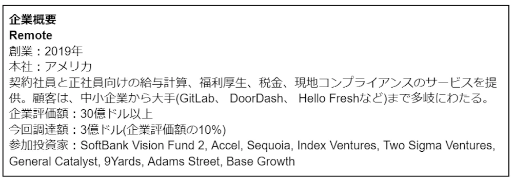 第三位は、リモート社員向けのHRサービスRemote(企業評価額:30億ドル以上)でした。世界各地で社員を雇い、管理するためには、現地の労働規制や人事管理など、さまざまな問題があり、コロナで在宅勤務が推奨される中で、これらの問題はより悪化しました。これまで、企業は、各国のローカル人材会社とそれぞれ契約を結ぶことで対処してきましたが、コストや管理が高くなりがちです。シンプルに一元管理を目指すのがRemoteです。現在、Remoteは60か国以上で展開しており、今年には100か国で展開する予定である(※3)ことから、世界のどこでもニーズが強い問題に取り組んでいる企業といえます。