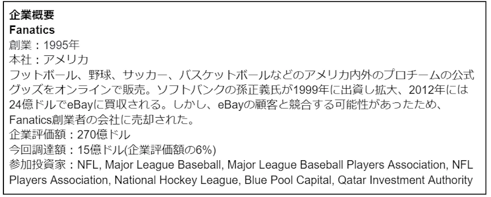 第一位は、スポーツ製品ECのFanatics(企業評価額:270億ドル)でした。この案件の特徴は、資金提供元の多くがVCではなく、アメリカのプロスポーツ団体であることです。今期売上は、50億ドルを見込んでおり、売上に対する企業評価額は5.4倍程度です。欧米や日本のスポーツメーカーのPSR(株価売上高倍率)は、1-2倍程度であるため(ナイキは例外で4.4倍)、Fanaticsの評価の高さがうかがえます。NFT、ゲーム、スポーツの賭けサイト事業に参入するなど、単なるEC会社にとどまるつもりはないようです。