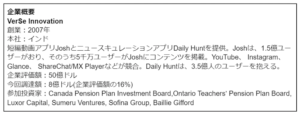 第二位は、短編動画とニュースキュレーションアプリを提供するVerSe Innovation(企業評価額:50億ドル)でした。インドでは、2020年にTikTokが禁止されたことをきっかけにローカルのアプリが台頭しました。MAU(マンスリーアクティブユーザー)に占めるDAU(ディリーアクティブユーザー)が49%とインスタグラム並みであり(※1)、インドでは高いエンゲージメントを誇っています。中国では、TikTokの中国版「抖音(Douyin)」における14歳未満のユーザーの利用時間を制限したり、ライブ配信を規制する計画を予定していたり、規制リスクが伴います。Daily Huntの類似サービスとしては、5000万ダウンロードと月間ユーザー2000万(2019年時点)をMAU持つスマートニュースがあげられます(※2)。Daily Huntはインド中心に展開している一方、スマートニュースは日米中心のため、現在は競合していませんが、今後の両社の動向に注目です。
