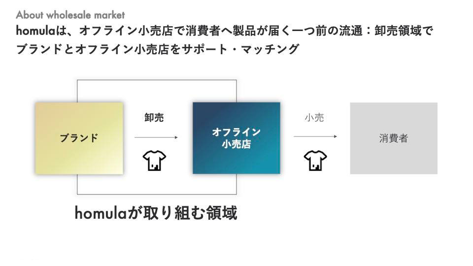 株式会社homulaは、小売店とファッション・生活雑貨ブランドをつなぎ、卸売・仕入れ取引の手段となるBtoBマーケットプレイス『homula』を運営する企業。 取引の手続きや与信など、小売バイヤーにとっての課題を同社が引き受ける形でブランドを擁するサプライヤーとのマッチングを図る。サプライヤーは、手間と余計なコストをかけずに新規卸先の開拓が可能。また、同サービスは展示会受注から在庫販売まで、資金回収の心配なく卸売業務をオールインワンで完結できるのが特徴。