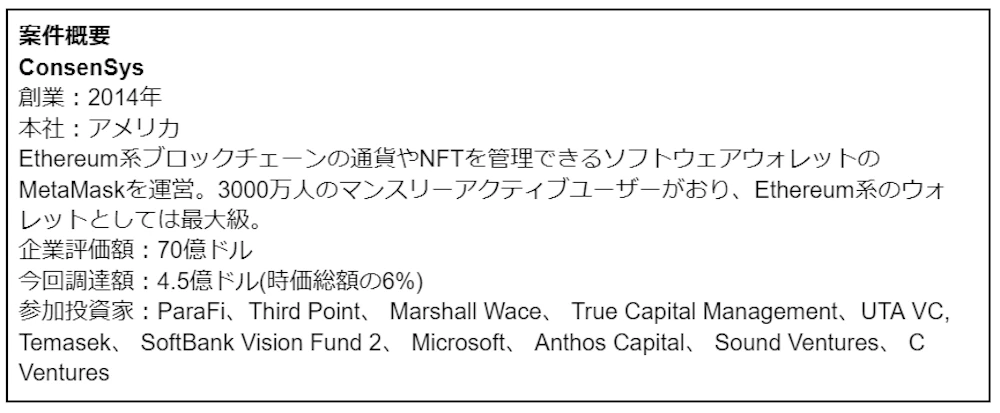 第二位は、仮想通貨のソフトウェアウォレットを提供するConsenSys(企業評価額:70億ドル)でした。ConsenSysが提供するMetamaskはEthereumを中心としたソフトウェアウォレットです。仮想通貨のなかでもビットコインに次いで時価総額が大きいEthereumのウォレットを提供したことで、Metamaskはユーザーを伸ばしてきました。Ethereumはブロック生成時間が早いため、15秒(ビットコインの約40分の1の速さ)で取引を終えることができるため、投資家に好まれてきました。一方で、NFTなどによる市場の拡大は引き続き見込まれるものの、競争環境の変化には注意が必要です。より安い取引手数料でのサービス提供が可能なSolanaなどが台頭しており、EthereumのNFTにおけるシェアは、2021年初めの約95%から直近では80%近辺にまで低下しています。(※1)
