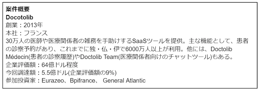 第三位は、医療SaaSツールを提供するDocotolib(企業評価額:64億ドル)でした。医療業界は、IT化による効率化の余地が大きいため、注目されています。日本では、光通信の子会社であるEPARKが診察予約の分野で強いです。EPARKは2019年にSBIキャピタルなどから200億円の大型資金調達を発表しています。