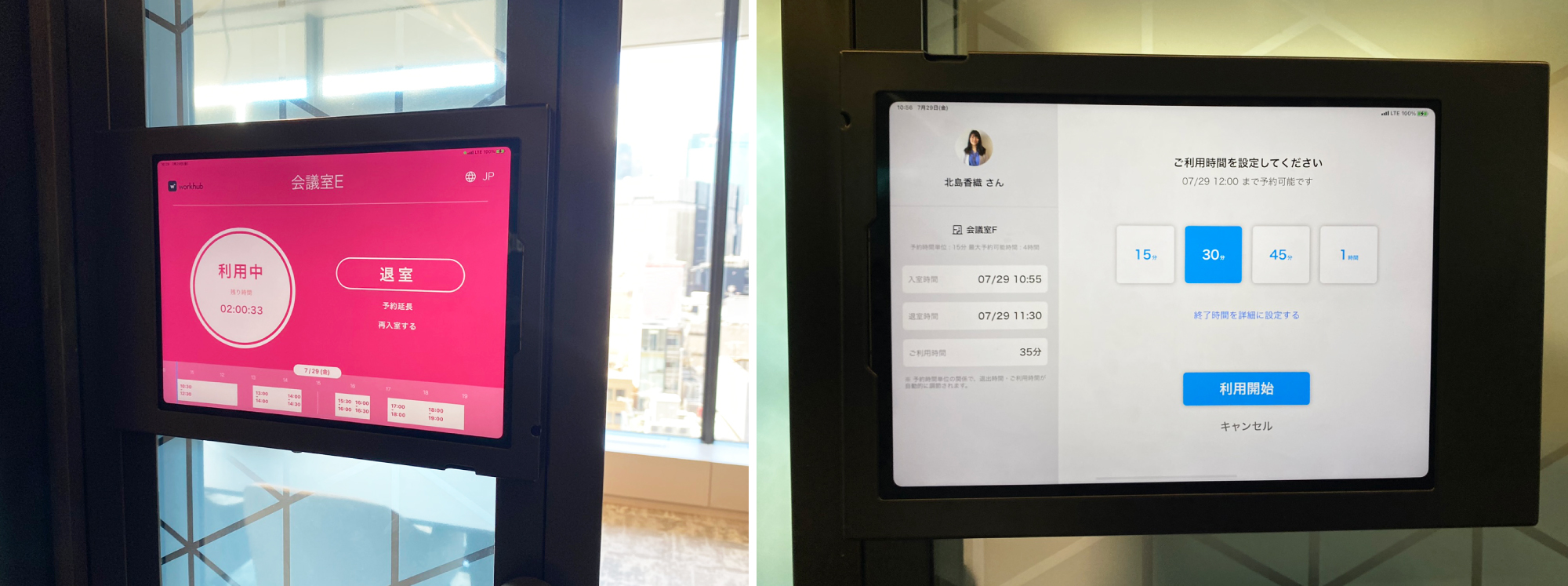各会議室には、会議室の利用をスムーズに行うタブレット用アプリ「workhub Room Support」を設置し、予約状況の表示や延長、「カラ」予約防止の自動キャンセル、予約時間終了前のお知らせなどに対応。ビットキー社員は顔登録がされており、顔での会議室即時予約や、顔でカギを解錠することもできるという。これならば、都度PCから会議室予約システムにアクセスする必要がなく、その場で利用状況の確認や予約をすることができる。このようなシステム導入によるオペレーションの改善が、スペース活用や業務効率化に直結するのは言うまでもない。
