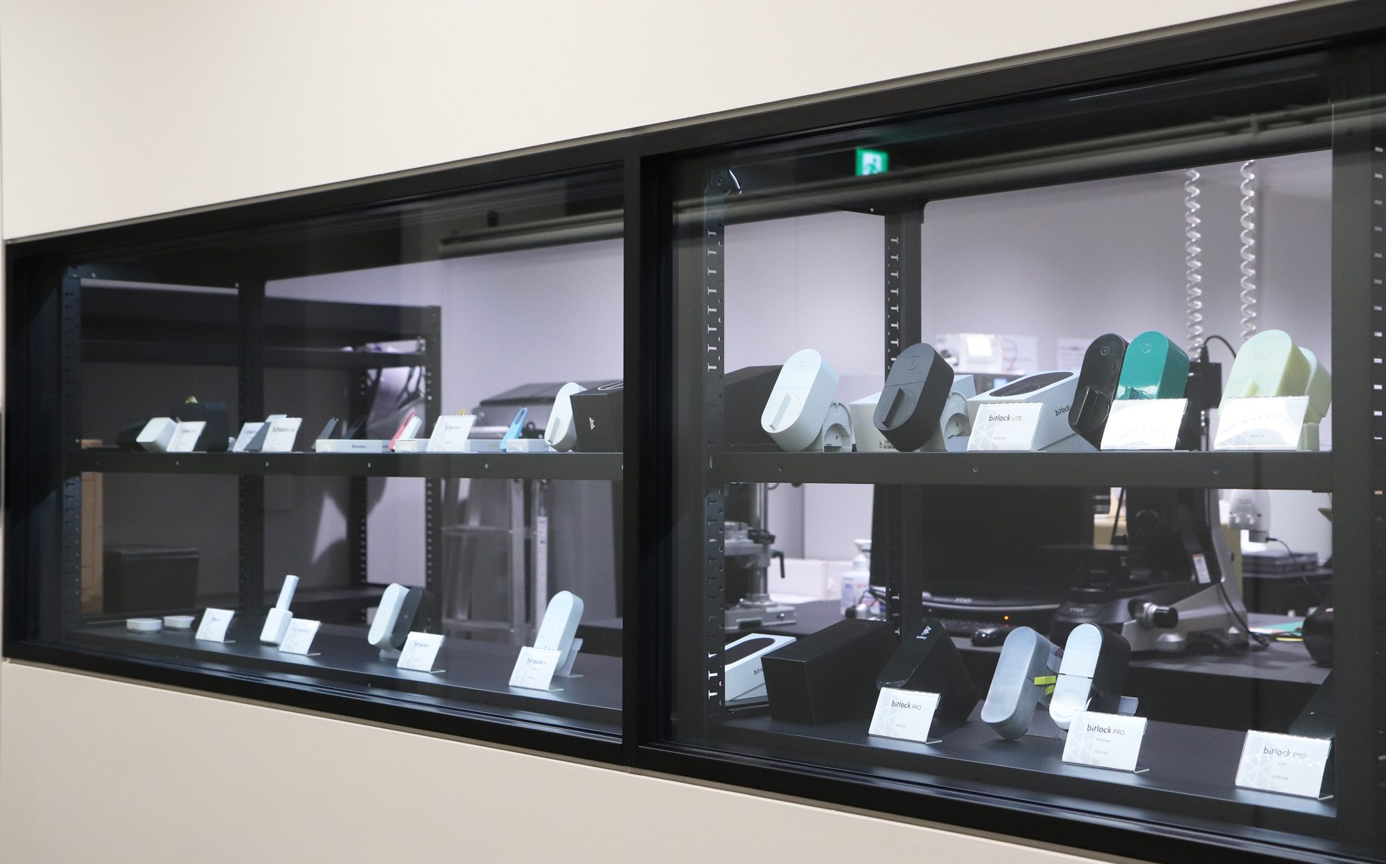 オフィスの中央に位置する工房の周りには、歴代製品がずらりと並ぶ。初代スマートロックからプロダクトが進化していった過程や、製品ラインナップの広がりを一目で見ることができる。