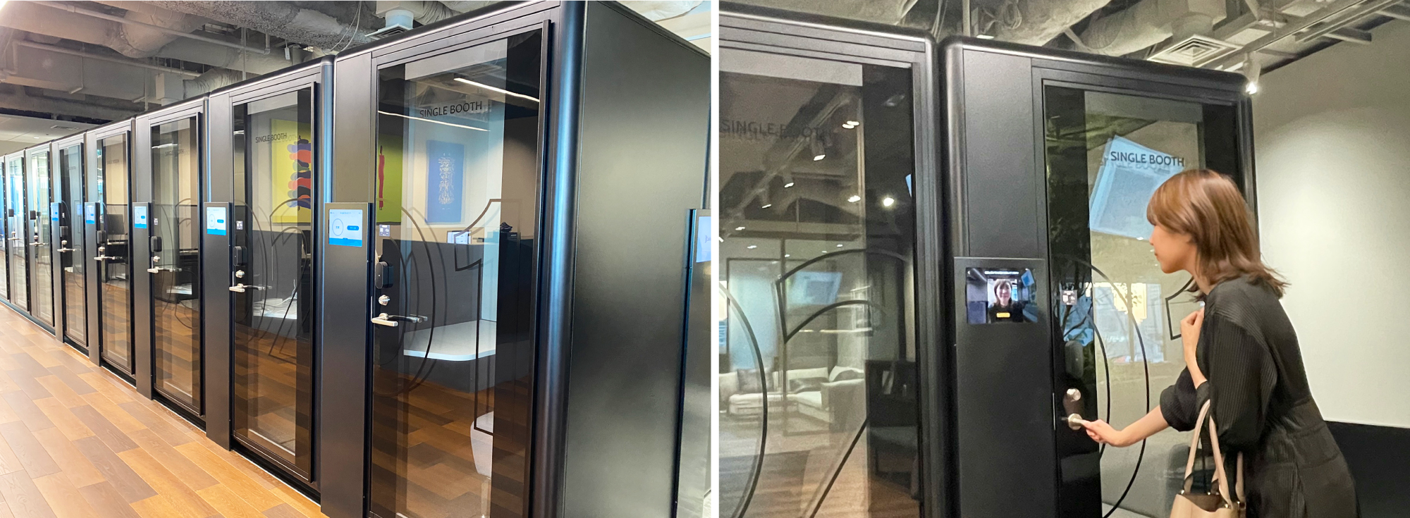 増加するWeb会議に対応するため、ワークブースは個人用が29台導入されている。会議室と同様「workhub Room Support」が設置されているので、簡単に予約や利用ができる。このワークブースは、スマートロック、利用者向けの予約サイト、ブース管理者向けのシステムなどをワンパッケージにした スマートワークブース「Bitkey work booth」としても販売されている。一般のオフィスはもちろんサテライトオフィスや住宅、商業施設の空きスペースなどへ導入が進んでいるという。