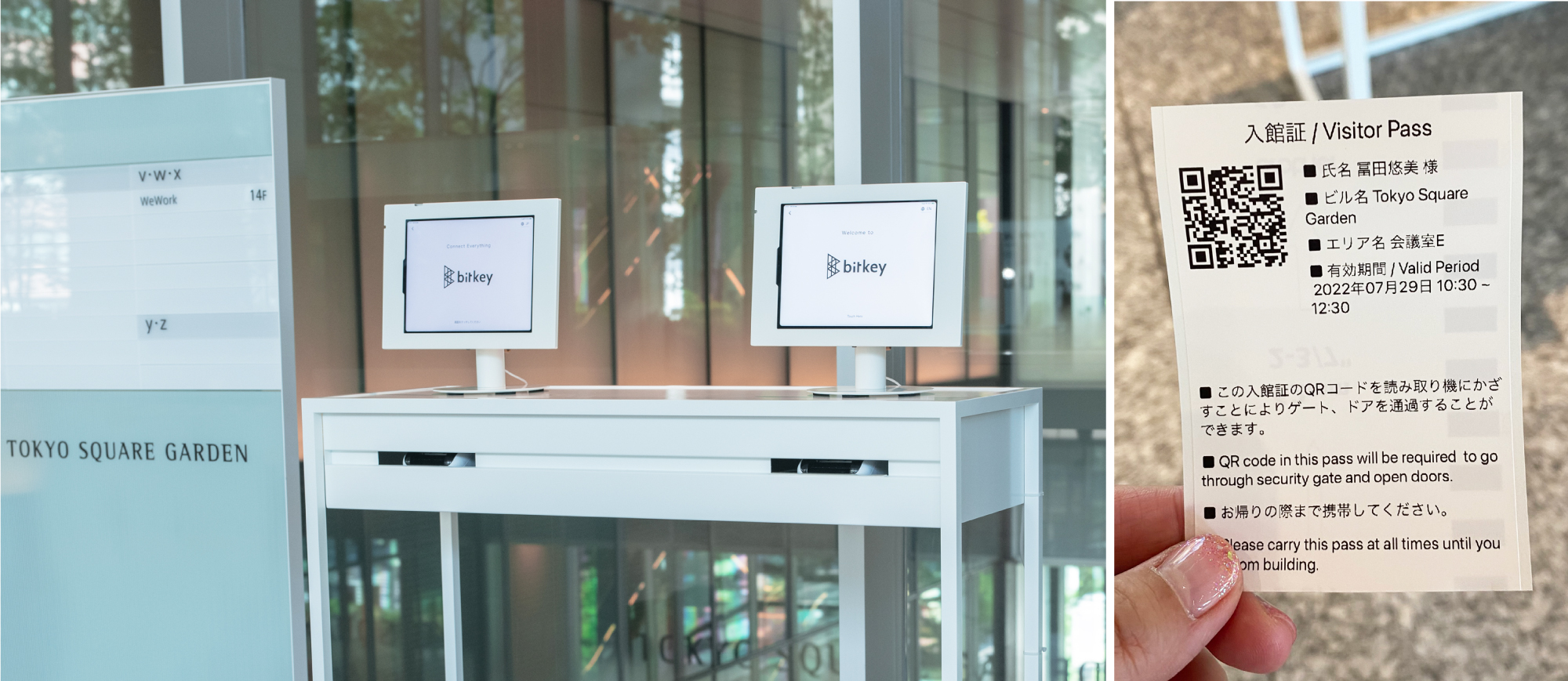 エントランスには「workhub Reception」という来訪者向けのスマート受付システムが設置されており、事前にメールで送られてきた入館用のQRコードを端末にかざすだけで、受付が完了。入館証が発行され、有人受付を介さずに直接オフィスへ向かうことができる。同時に、打ち合わせ予定のビットキー社員に入館が通知される。