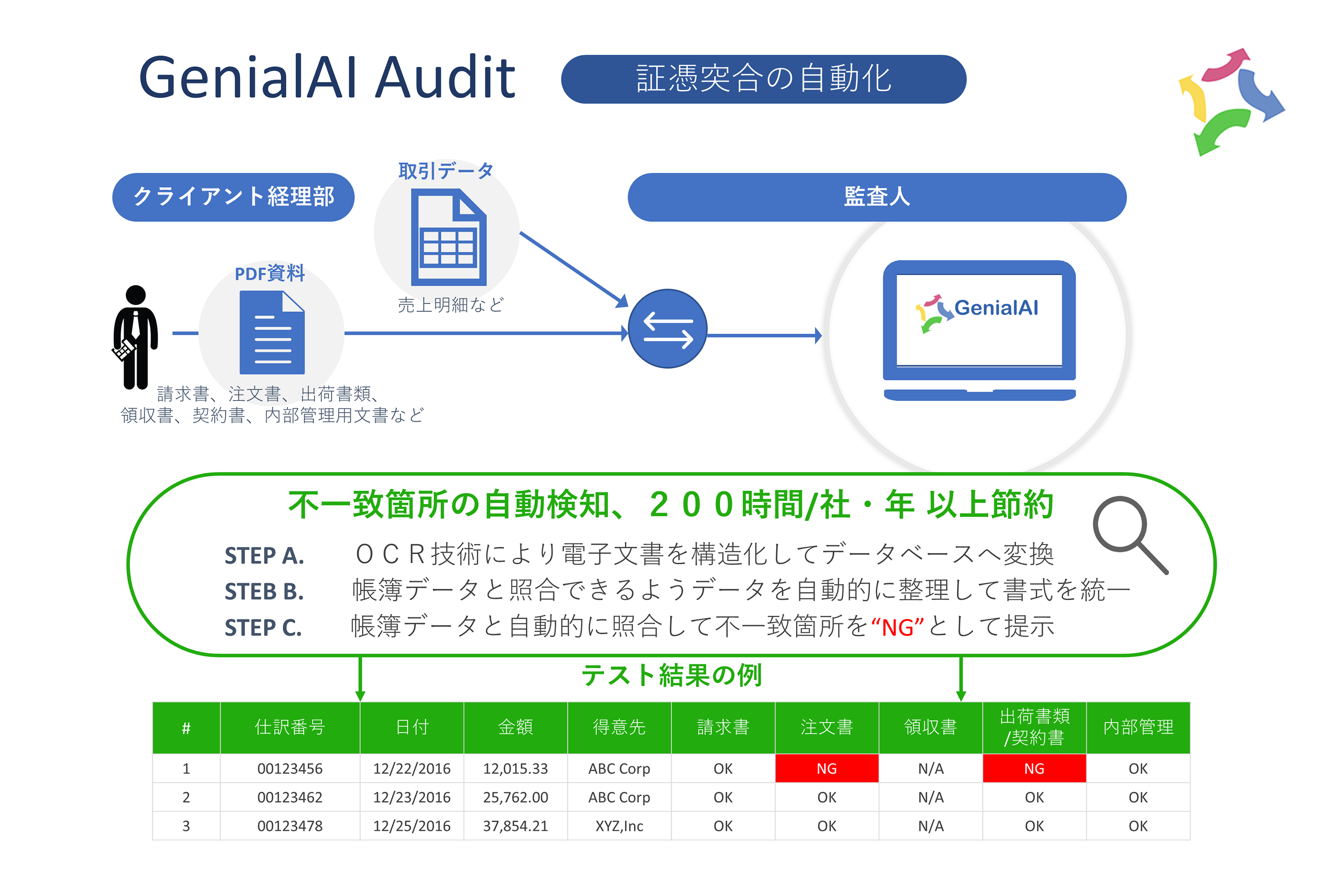 「ジーニアルAI」は、監査法人向けに証憑突合(※1)を自動化する自己学習型の監査ツールだ。