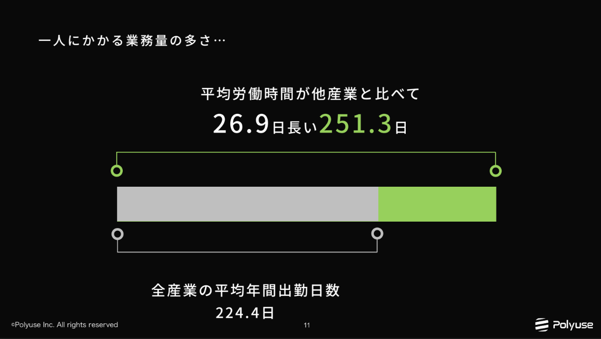 大岡氏:建設業界は慢性的な人材不足が続いています。高齢化も相まって、建設業界における55歳以上の割合は全体の43%を占めています。建設の現場で作業している技能労働者は、この先2年で50〜100万人ほど不足すると言われています。さらに、建設業界では1人あたりの業務量が多く、全産業の平均年間出勤日数に比べて26.9日も長い。