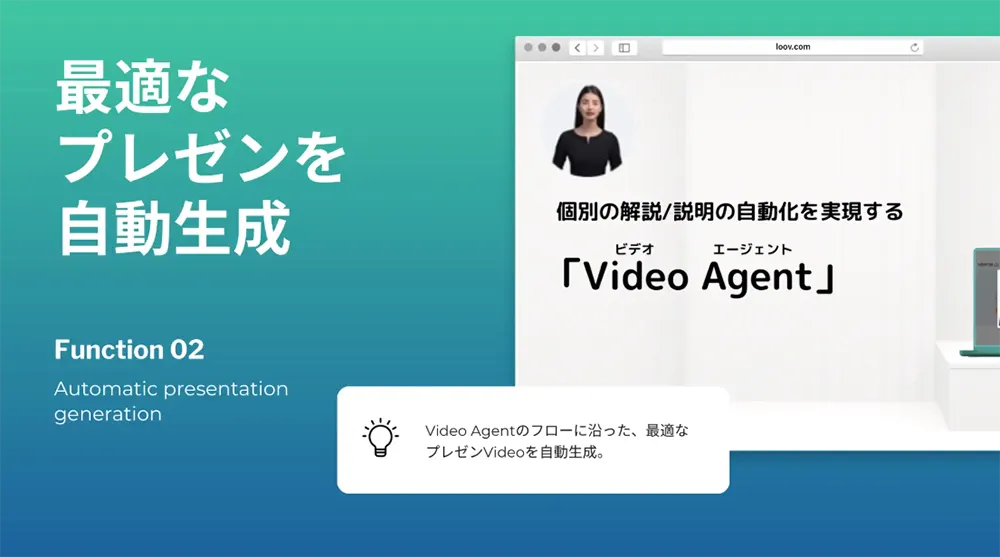 LOOVは、ユーザーの属性や選択肢に応じて動画の内容が変化するインタラクティブ動画を、ノーコードで簡単に作成・運用できるソリューションを提供している。こうした機能群を同社は「Video Agent」という呼称で体系化しており、プレゼンや説明業務を再現性高く自動化することを目指している。