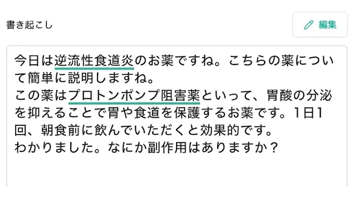 利用の流れは非常にシンプルです。医師が診察を開始する際に、アプリ上の「新規録音開始」ボタンを押すと診察中の会話が録音され、リアルタイムで文字起こしされるようになります。診察が終わると、AIが5秒ほどで自動的にカルテを生成します。カルテには、患者の訴え、診断、処置内容などがSOAPに沿った形で記載されます。医師は内容を確認し、必要に応じて修正を加えることができるのです。