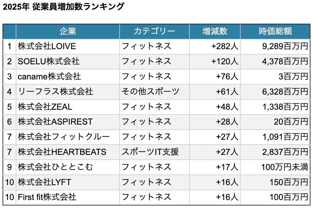 増加数ランキング1位は昨年同様、女性専用のフィットネススタジオを運営する LOIVE (旧社名 LIFE CREATE)である。同社は、2025年4月に上場を果たし、従業員数を大きく増加させている。