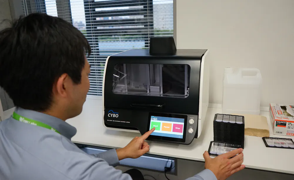 顕微鏡検査はがん検診や病理診断などで幅広く活用されているものの、病理医や検査士の経験や知識に依存しており、効率化や精度の安定化が課題となっている。CYBOはこの課題を解決するために、検体画像を高速かつ高品質でデジタル化する技術、および画像を解析するAI技術を統合したプラットフォーム製品「SHIGI」の開発を進めてきた。