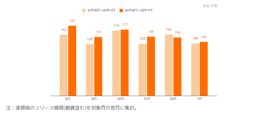 マンスリーレポートでは、2025年1月の日本のスタートアップ市場を資金調達動向の観点から振り返る。あわせて、注目の調達案件を踏まえながら、スタートアップ市場の直近のトレンドを解説する。なお、本データは公表資料をもとに作成しており、資金調達額には融資も含む。