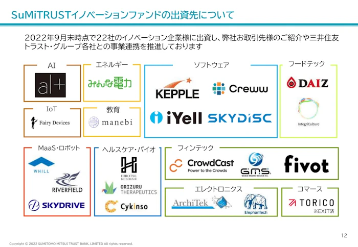 藥井氏:設立から2年で約400社の企業に出会い、投資実績は22社になりました。その投資実績企業を見ていただくと、投資領域を絞っていないことが明確かと思います。AI、IoT、フィンテックだけではなく、脱炭素などのエネルギーや、フードテック、ヘルスケア、バイオ、半導体などにも投資しています。