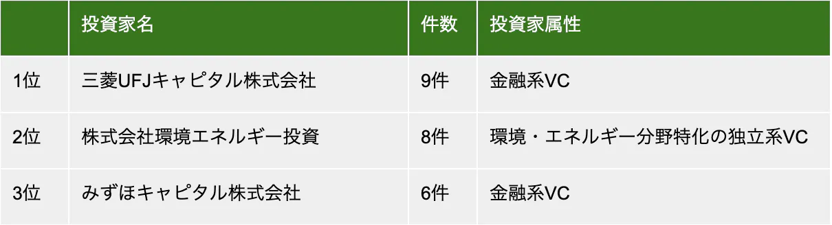 投資家動向を見ると、三菱UFJキャピタルが9件、環境エネルギー投資が8件、みずほキャピタルが6件と、金融系VCや独立系VCが上位に位置している。さらに事業会社や金融機関、官民ファンドなども継続的に投資を行っており、脱炭素が一過性のテーマ投資ではなく、中長期的に資金が投じられる成長分野として位置づけられていることが分かる。