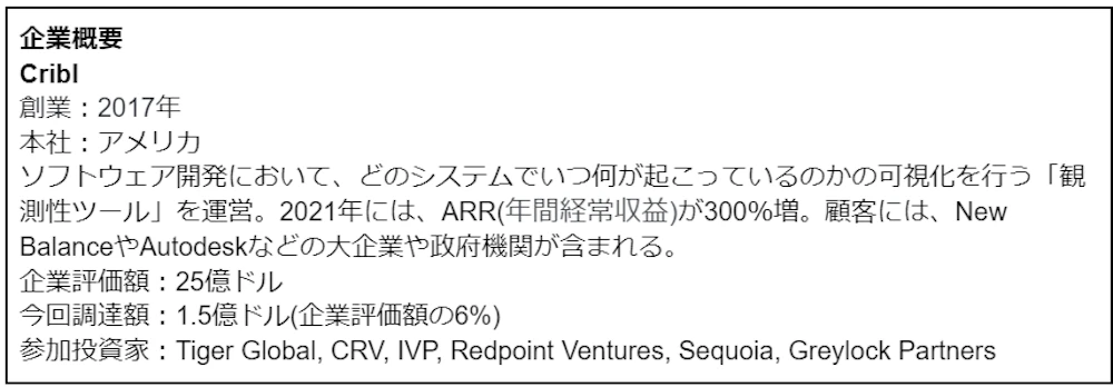 第二位は、ソフトウェア開発において、どのシステムでいつ何が起こっているのかを観測可能にするCribl(企業評価額 25億ドル)です。同社が提供する「観測性ツール」は、米国の多くの企業が事業の成功に必要不可欠と考えており、2024年までに数百億ドルの市場に達するという予測もあります(※1)。そのため、同社の競合も多く、Observe、Edge Delta、Monte Carlo、Lightrun、Chronosphereなどが含まれます。その中で、同社はベンダー中立でオープンな設計であることを差別化ポイントに挙げています。