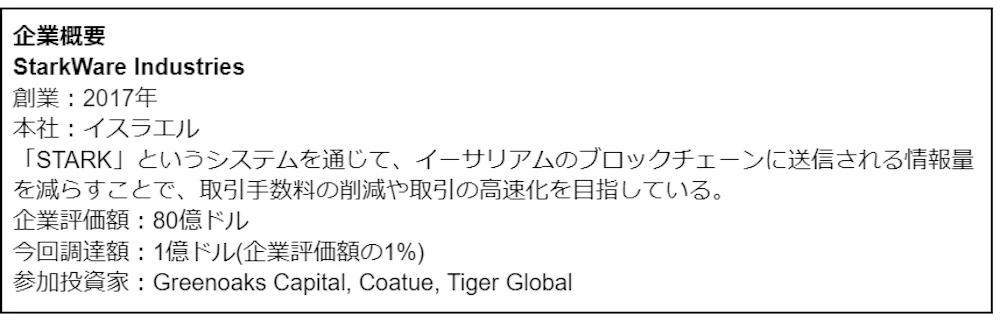 第一位は、イーサリアムの取引の効率化を担うStarkWare Industries(企業評価額 80億ドル)です。ビットコインが年初来36%減、イーサリアムが年初来50%減(5/30時点)と仮想通貨の相場が冷え込む中で大型の資金調達を行えたことは、同社のビジネスモデルに対する投資家の高い確信を示しています。