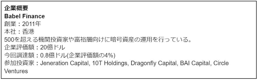 第三位は、機関投資家向けの暗号資産運用会社Babel Finance(企業評価額 20億ドル)です。同社は、元々暗号資産のマイニング業者やトレーダー向けの金融サービスを提供していました。しかし、2020年ごろから機関投資家が暗号資産を投資ポートフォリオの一部として組み込む流れを受けて、機関投資家向けの暗号資産の運用を始めました。機関投資家の信頼を勝ち取るため、自社の資金調達に際して著名なプライベート・エクイティやベンチャー・キャピタルを投資家として加えてきました。