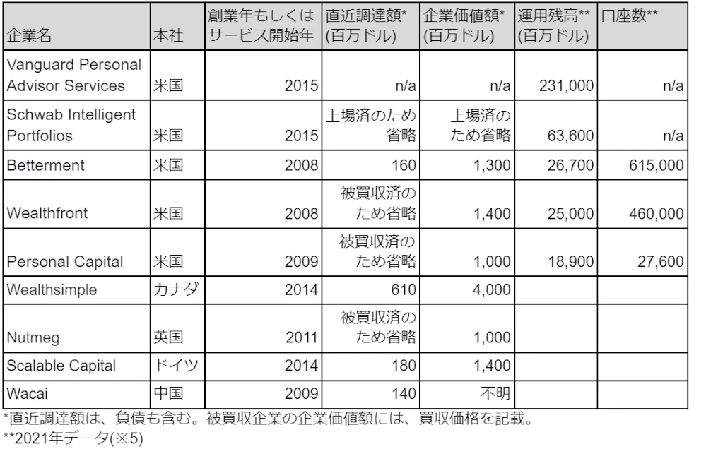 米国市場では、既存金融機関やネット証券の規模が大きい。最大手は、インデックスファンドに強みを持つVanguardである。VanguardのロボアドバイザーのポートフォリオにはVanguardのETFが組み入れられており、本業との相乗効果を生み出している。また、Vanguardのロボアドバイザーの規模が大きい理由としては、Vanguardが運用する他の商品からの移行が大きかったことも挙げられる。また、運用残高が非開示なため、下記の表には記載していないが、投資信託大手のフィデリティ証券もSchwab Intelligent Portfoliosと同程度の運用残高を保有している可能性がある(※4)。